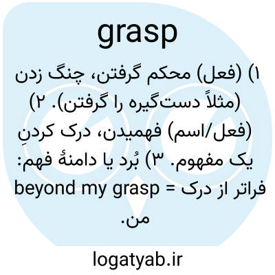 ۱) (فعل) محکم گرفتن، چنگ زدن (مثلاً دست‌گیره را گرفتن). ۲) (فعل/اسم) فهمیدن، درک کردنِ یک مفهوم. ۳) بُرد یا دامنهٔ فهم: beyond my grasp = فراتر از درک من.