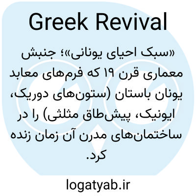 «سبک احیای یونانی»؛ جنبش معماری قرن ۱۹ که فرم‌های معابد یونان باستان (ستون‌های دوریک، ایونیک، پیش‌طاق مثلثی) را در ساختمان‌های مدرن آن زمان زنده کرد.