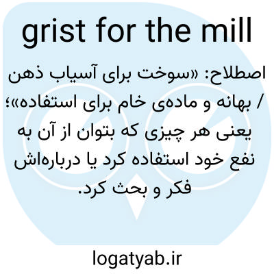 📌 چیزی که میتواند به نفع کسی استفاده شود، مانند عبارت «این دادههای به ظاهر بیفایده، وقتی او شکایتی مطرح میکند، برای آسیاب آرد میشوند». این عبارت به آرد اشاره دارد، مقدار دانهای که میتوان در یک زمان آسیاب کرد. [اواخر دهه ۱۵۰۰]