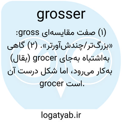 (۱) صفت مقایسه‌ای gross: «بزرگ‌تر/چندش‌آورتر». (۲) گاهی به‌اشتباه به‌جای grocer (بقال) به‌کار می‌رود، اما شکل درست آن grocer است.
