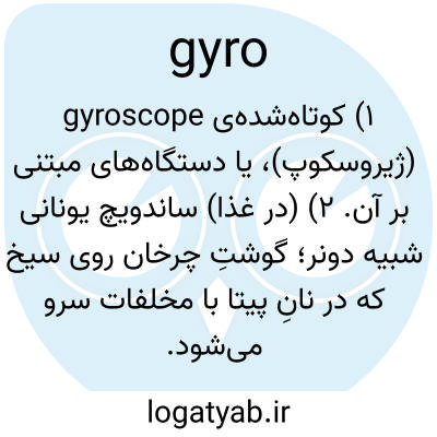 ۱) کوتاه‌شده‌ی gyroscope (ژیروسکوپ)، یا دستگاه‌های مبتنی بر آن. ۲) (در غذا) ساندویچ یونانی شبیه دونر؛ گوشتِ چرخان روی سیخ که در نانِ پیتا با مخلفات سرو می‌شود.