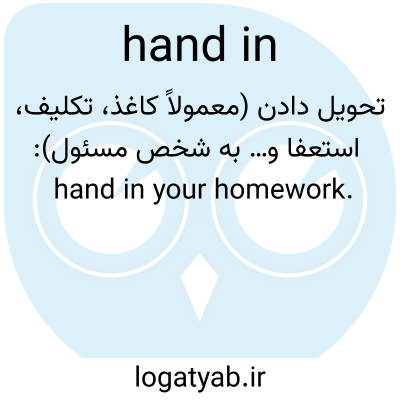تحویل دادن (معمولاً کاغذ، تکلیف، استعفا و… به شخص مسئول): hand in your homework.