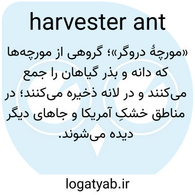 📌 هر یک از چندین مورچه قرمز یا سیاه، به ویژه از جنس Pogonomyrmex، از جنوب غربی ایالات متحده، که از دانههای علفها تغذیه و آنها را ذخیره میکنند.