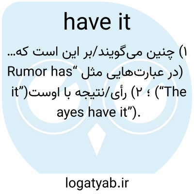 📌 رابطه جنسی داشتن، مانند «دو سگ در حیاط خلوت داشتند رابطه جنسی برقرار میکردند». [محاورهای؛ اوایل دهه ۱۹۰۰] همچنین به اصطلاحات بعدی که با have it شروع میشوند مراجعه کنید؛ نه «have it».
