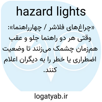 📌 همچنین نامیده میشود: چراغهای هشدار خطر. چراغهای نشانگر وسیله نقلیه موتوری که همزمان چشمک میزنند تا نشان دهند که وسیله نقلیه ثابت است و به طور موقت مانع ترافیک میشود.