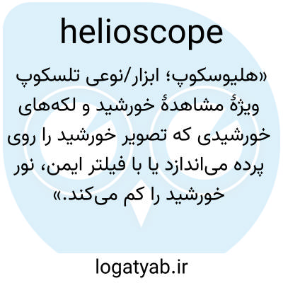 «هلیوسکوپ؛ ابزار/نوعی تلسکوپ ویژهٔ مشاهدهٔ خورشید و لکه‌های خورشیدی که تصویر خورشید را روی پرده می‌اندازد یا با فیلتر ایمن، نور خورشید را کم می‌کند.»
