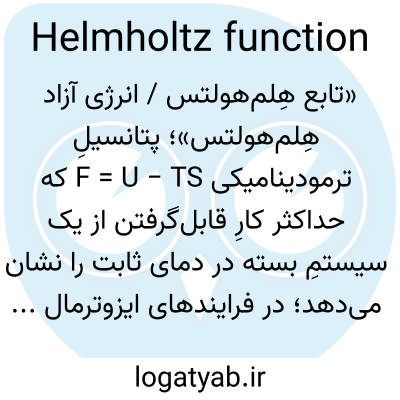 📌 تابع ترمودینامیکی یک سیستم که برابر با انرژی داخلی آن منهای حاصلضرب دمای مطلق و آنتروپی آن است: کاهش در این تابع برابر با حداکثر مقدار کار موجود در طی یک فرآیند ایزوترمال برگشتپذیر است.