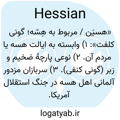 «هسیَن / مربوط به هِسّه؛ گونی کلفت»: ۱) وابسته به ایالت هسه یا مردم آن. ۲) نوعی پارچهٔ ضخیم و زبر (گونی کنفی). ۳) سربازان مزدور آلمانی اهل هسه در جنگ استقلال آمریکا.