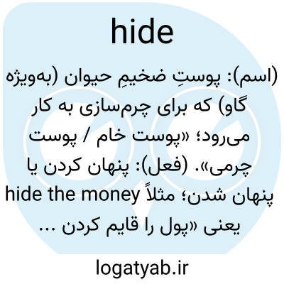 (اسم): پوستِ ضخیمِ حیوان (به‌ویژه گاو) که برای چرم‌سازی به کار می‌رود؛ «پوست خام / پوست چرمی». (فعل): پنهان کردن یا پنهان شدن؛ مثلاً hide the money یعنی «پول را قایم کردن».
