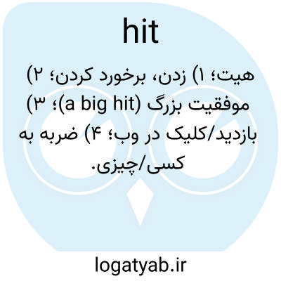 هیت؛ ۱) زدن، برخورد کردن؛ ۲) موفقیت بزرگ (a big hit)؛ ۳) بازدید/کلیک در وب؛ ۴) ضربه به کسی/چیزی.