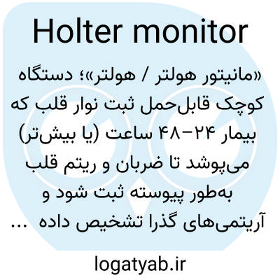 «مانیتور هولتر / هولتر»؛ دستگاه کوچک قابل‌حمل ثبت نوار قلب که بیمار ۲۴–۴۸ ساعت (یا بیش‌تر) می‌پوشد تا ضربان و ریتم قلب به‌طور پیوسته ثبت شود و آریتمی‌های گذرا تشخیص داده شوند.