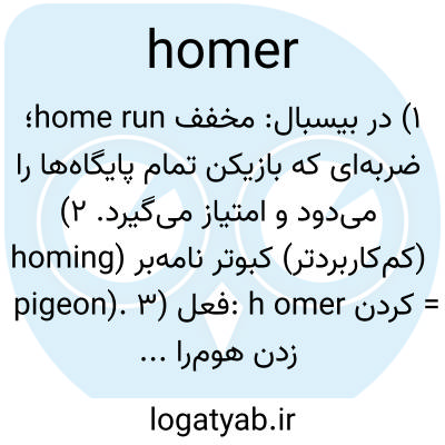 ۱) در بیسبال: مخفف home run؛ ضربه‌ای که بازیکن تمام پایگاه‌ها را می‌دود و امتیاز می‌گیرد. ۲) (کم‌کاربردتر) کبوتر نامه‌بر (homing pigeon). ۳) فعل: h omer کردن = زدن هوم‌ران.