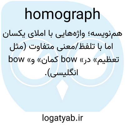 📌 کلمهای با شکل نوشتاری یکسان با کلمهی دیگر اما با معنی و ریشهی معمولاً متفاوت، چه تلفظشان یکسان باشد و چه نباشد، مانند bear 1 «حمل کردن؛ نگهداری کردن» و bear 2 «حیوان» یا lead 1 «هدایت کردن» و lead 2 «فلز».