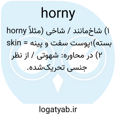 ۱) شاخ‌مانند / شاخی (مثلاً horny skin = پوست سفت و پینه‌بسته)؛ ۲) در محاوره: شهوتی / از نظر جنسی تحریک‌شده.
