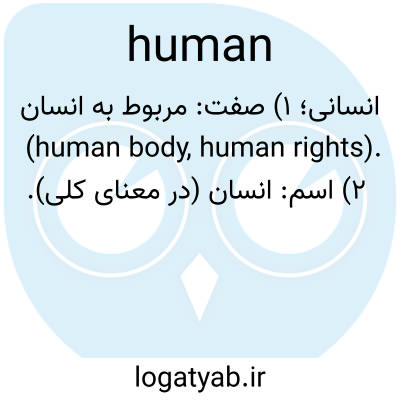 انسانی؛ ۱) صفت: مربوط به انسان (human body, human rights). ۲) اسم: انسان (در معنای کلی).