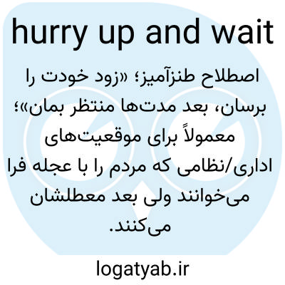 اصطلاح طنزآمیز؛ «زود خودت را برسان، بعد مدت‌ها منتظر بمان»؛ معمولاً برای موقعیت‌های اداری/نظامی که مردم را با عجله فرا می‌خوانند ولی بعد معطلشان می‌کنند.