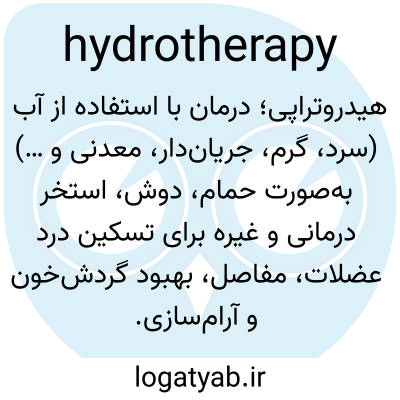 📌 درمان ناتوانی جسمی، آسیب یا بیماری با غوطهور کردن تمام یا بخشی از بدن در آب برای تسهیل حرکت، بهبود زخم، تسکین درد و غیره، معمولاً تحت نظارت یک درمانگر آموزشدیده.