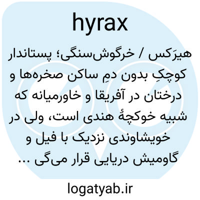 📌 هر یک از چندین گونه از پستانداران کوچک از راسته Hyracoidea، ساکن آفریقا و منطقه مدیترانه، که دارای پاها، گوشها و دم کوتاه و ناخنهای سممانند در انگشتان پا هستند.