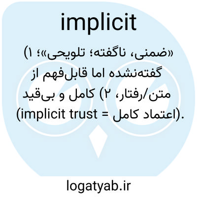 «ضمنی، ناگفته؛ تلویحی»؛ ۱) گفته‌نشده اما قابل‌فهم از متن/رفتار، ۲) کامل و بی‌قید (implicit trust = اعتماد کامل).