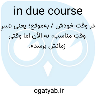 📌 همچنین، در زمان مناسب؛ در زمان مناسب؛ به موقع؛ همه در زمان مناسب. پس از یک فاصله زمانی مناسب، در یک مدت زمان معقول. به عنوان مثال، در زمان مناسب، ما جزئیات این ترتیب را مورد بحث قرار خواهیم داد، یا در زمان مناسب، مدافع شواهد جدیدی ارائه خواهد کرد، یا شما برنامه را به موقع یاد خواهید گرفت، یا ما به یک راه حل خواهیم رسید، همه در زمان مناسب. چاسر در اواخر دهه 1300 از عبارت in due time استفاده کرد و سایر کاربردها در طول چند قرن بعدی پدید آمدند. با این حال، برای معنی دیگر، به عبارت in good time نیز مراجعه کنید.