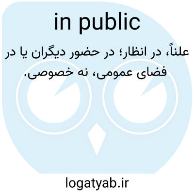 📌 آشکارا، در معرض دید یا دسترسی عموم. برای مثال، آنها هرگز با هم در ملاء عام ظاهر نشدهاند. [حدود ۱۴۵۰] برای متضاد، به خصوصی مراجعه کنید.