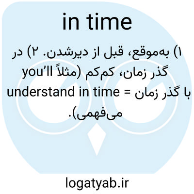 📌 علاوه بر اصطلاحی که با in time شروع میشود، به at this point (در زمان)؛ in due time؛ in good time؛ in the nick of (درست سر وقت)؛ on time؛ stitch in time نیز مراجعه کنید.