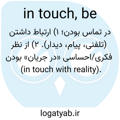 📌 همچنین، با [افراد] در تماس باشید. در ارتباط باشید یا با [افراد] در تماس باشید، مانند: «مطمئن شوید که پس از رسیدن در تماس هستید»، یا «نماینده ما واقعاً با موکلانش در تماس است». یک اصطلاح مرتبط «در تماس باشید» است، به معنی «تماس را شروع کنید»، مانند: «ما سعی کردیم با شما تماس بگیریم اما شما خارج از شهر بودید»، و به معنی «در ارتباط یا تماس باقی بمانید»، مانند: «با جیم مستقر در کره، حفظ ارتباط سخت بود»، یا «با ما در تماس باشید». این اصطلاح، تماس فیزیکی را به ارتباط تبدیل میکند. [اواخر دهه ۱۸۰۰]