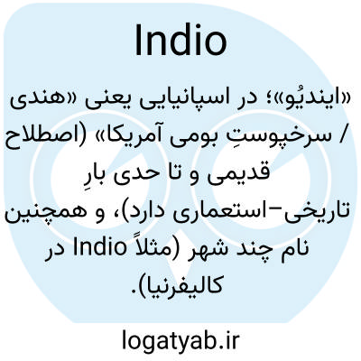 «ایندیُو»؛ در اسپانیایی یعنی «هندی / سرخپوستِ بومی آمریکا» (اصطلاح قدیمی و تا حدی بارِ تاریخی–استعماری دارد)، و همچنین نام چند شهر (مثلاً Indio در کالیفرنیا).