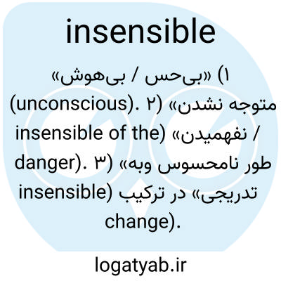 ۱) «بی‌حس / بی‌هوش» (unconscious). ۲) «متوجه نشدن / نفهمیدن» (insensible of the danger). ۳) «به‌طور نامحسوس و تدریجی» در ترکیب (insensible change).
