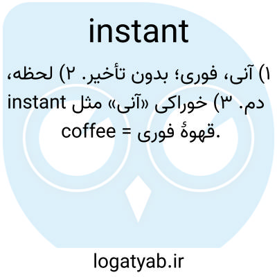 ۱) آنی، فوری؛ بدون تأخیر. ۲) لحظه، دم. ۳) خوراکی «آنی» مثل instant coffee = قهوهٔ فوری.