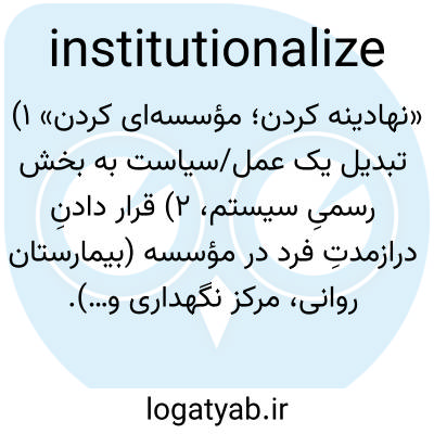 «نهادینه کردن؛ مؤسسه‌ای کردن» ۱) تبدیل یک عمل/سیاست به بخش رسمیِ سیستم، ۲) قرار دادنِ درازمدتِ فرد در مؤسسه (بیمارستان روانی، مرکز نگهداری و…).