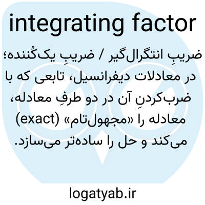 📌 عاملی که هنگام ضرب یک معادله دیفرانسیل در سمت راست برابر با صفر، معادله را انتگرالپذیر میکند، معمولاً با تبدیل عبارت حاصل به یک دیفرانسیل دقیق از یک تابع.