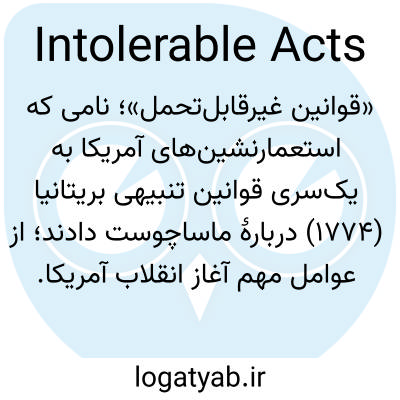 📌 همچنین به عنوان قوانین قهری شناخته میشود؛ مجموعهای از اقدامات بریتانیا که در سال ۱۷۷۴ تصویب شد و برای مجازات مستعمرهنشینان ماساچوست به دلیل مهمانی چای بوستون طراحی شده بود. به عنوان مثال، یکی از این قوانین، بندر بوستون را تا زمانی که مستعمرهنشینان هزینه چایی را که نابود کرده بودند، پرداخت نکنند، تعطیل کرد. اگرچه این قوانین برای جلوگیری از مخالفت استعمارگران با بریتانیا در نظر گرفته شده بود، اما تنها آن را شعلهورتر کرد.