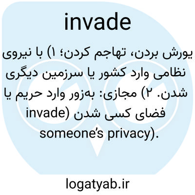 یورش بردن، تهاجم کردن؛ ۱) با نیروی نظامی وارد کشور یا سرزمین دیگری شدن. ۲) مجازی: به‌زور وارد حریم یا فضای کسی شدن (invade someone’s privacy).