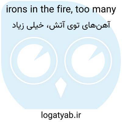 📌 فعالیتها یا تعهدات بسیار زیاد به طور همزمان. برای مثال، بیل امسال آهنهای زیادی را در آتش دارد که نمیتواند از پس اسبابکشی برآید. این عبارت در ابتدا به آهنگری اشاره داشت که آهنهای زیادی را به طور همزمان گرم میکرد و بنابراین برخی از آنها در آهنگری خراب میشدند. [اواسط دهه ۱۵۰۰]