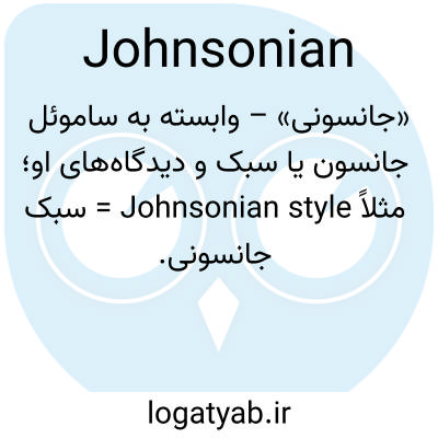 «جانسونى» – وابسته به ساموئل جانسون یا سبک و دیدگاه‌های او؛ مثلاً Johnsonian style = سبک جانسونی.