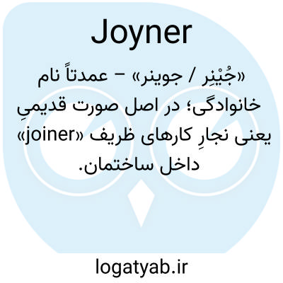 «جُیْنِر / جوینر» – عمدتاً نام خانوادگی؛ در اصل صورت قدیمیِ «joiner» یعنی نجارِ کارهای ظریف داخل ساختمان.