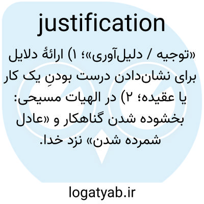 📌 همچنین به آن عادل شمردگی از طریق ایمان گفته میشود. الهیات، عمل خدا که به موجب آن بشر عادل شمرده میشود یا مورد حسابرسی قرار میگیرد، یا از گناه یا مجازات گناه مبرا میشود.