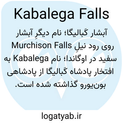 📌 همچنین: آبشار مورچیسون. تندآبهایی در پایین دست رودخانه نیل ویکتوریا، حدود ۳۵ کیلومتری (۲۲ مایلی) شرق دریاچه آلبرت، جایی که رود نیل ۱۲۰ متر (۴۰۰ فوت) پایین میرود.