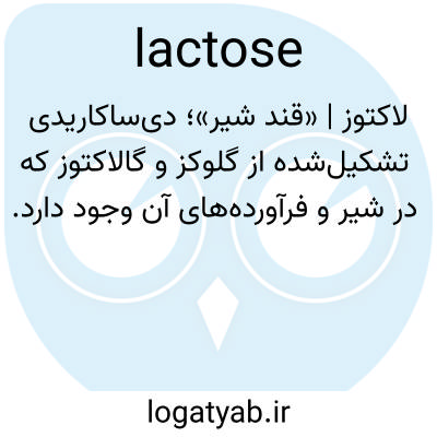 📌 بیوشیمی، یک دیساکارید، C12H22O11، موجود در شیر، که پس از هیدرولیز، گلوکز و گالاکتوز تولید میکند.