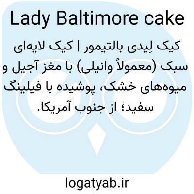 کیک لِیدی بالتیمور | کیک لایه‌ای سبک (معمولاً وانیلی) با مغز آجیل و میوه‌های خشک، پوشیده با فیلینگ سفید؛ از جنوب آمریکا.