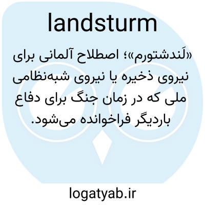 لندستورم، lant′stōōrm، اسم. در آلمان و سوئیس، نوعی مالیات عمومی در زمان اضطرار ملی - که در آلمان شامل همه مردان بین هفده تا چهل و پنج سال میشد: نیرویی که به این منظور فراخوانده شد.