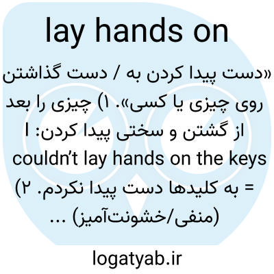 «دست پیدا کردن به / دست گذاشتن روی چیزی یا کسی». ۱) چیزی را بعد از گشتن و سختی پیدا کردن: I couldn’t lay hands on the keys = به کلیدها دست پیدا نکردم. ۲) (منفی/خشونت‌آمیز) دست‌درازی یا ضرب‌وشتم: Don’t you lay hands on me! ۳) در معنای دینی، گذاشتن دست روی سر کسی برای دعا و برکت (ر.ک laying on of hands).