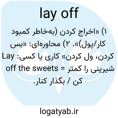 ۱) «اخراج کردن (به‌خاطر کمبود کار/پول)». ۲) محاوره‌ای: «بس کردن، ول کردن» کاری یا کسی: Lay off the sweets = شیرینی را کمتر کن / بگذار کنار.