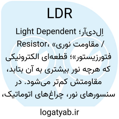اِل‌دی‌آر؛ Light Dependent Resistor، «مقاومت نوری / فتورزیستور»؛ قطعه‌ای الکترونیکی که هرچه نور بیشتری به آن بتابد، مقاومتش کم‌تر می‌شود. در سنسورهای نور، چراغ‌های اتوماتیک، دزدگیر و… به‌کار می‌رود.