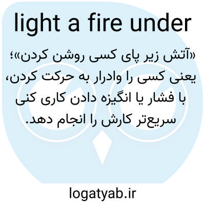 📌 همچنین، زیر [چیزی] آتش روشن کنید. [چیزی را] به کاری ترغیب یا تشویق کنید، مثلاً اگر زیر [محدوده/کمیته/...] آتش روشن نکنیم، آنها هرگز کاری انجام نخواهند داد. این اصطلاح عامیانه اغراقآمیز، نور را به معنای «آتش زدن» به کار میبرد، کاربردی که به اواسط دهه ۱۱۰۰ میلادی برمیگردد.
