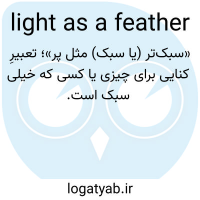 📌 بسیار سبک. این تشبیه میتواند برای اشاره به وزن فیزیکی، مانند «این بار به سبکی یک پر است» یا برای اشاره به بافت، مانند «این کیک به سبکی یک پر است» استفاده شود. [اواسط دهه ۱۵۰۰ میلادی]