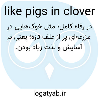 📌 بسیار راضی، مانند عبارت «آنها حقوق بازنشستگی خوبی داشتند و مانند خوکها در شبدر زندگی میکردند». این عبارت به خوکها اشاره دارد که اجازه داشتند هر چقدر که میخواهند شبدر، غذای مورد علاقهشان، بخورند. این عبارت در روزنامه بوستون گازت در ۷ ژانویه ۱۸۱۳ منتشر شد: «کاناداییها! سپس دسته دسته بیایید و از این پس مانند خوکها در شبدر زندگی کنید.» [اوایل دهه ۱۸۰۰]