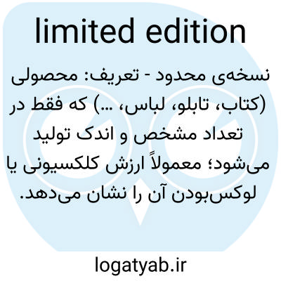نسخه‌ی محدود - تعریف: محصولی (کتاب، تابلو، لباس، …) که فقط در تعداد مشخص و اندک تولید می‌شود؛ معمولاً ارزش کلکسیونی یا لوکس‌بودن آن را نشان می‌دهد.
