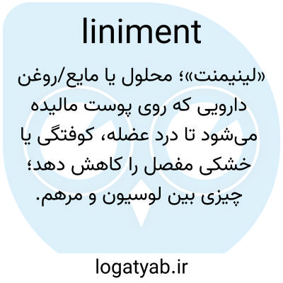 «لینیمنت»؛ محلول یا مایع/روغن دارویی که روی پوست مالیده می‌شود تا درد عضله، کوفتگی یا خشکی مفصل را کاهش دهد؛ چیزی بین لوسیون و مرهم.
